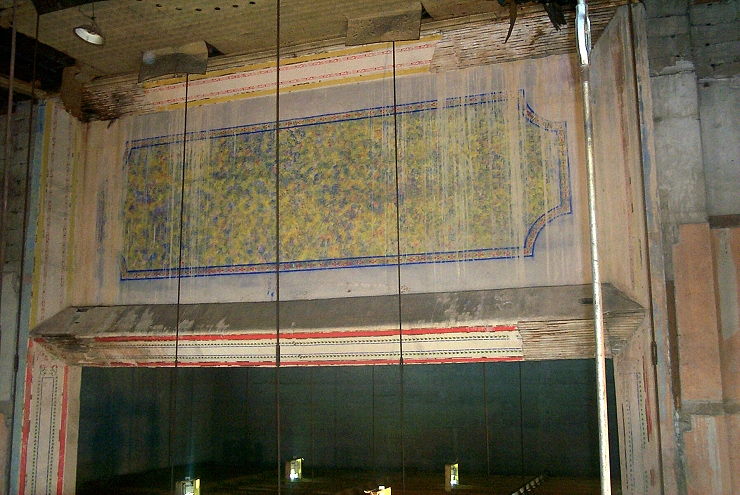 This view is from the first balcony level. It shows years of water damage. The entire building now has a new roof which will stop the water infiltration. The vertical bars seen here support this false ceiling. The metal ceiling has been bent down to install the bars. The proscenium arch is 32 feet wide by 25 feet high. Behind the top of the arch the stage area extends upward another 30 feet for a total of 55 feet from stage floor to the rigging loft gridiron. Wooden stairs, two levels of catwalks and the high latticework gridiron floor were used to rig scenery to be lifted into and lowed from the lofty loft. |