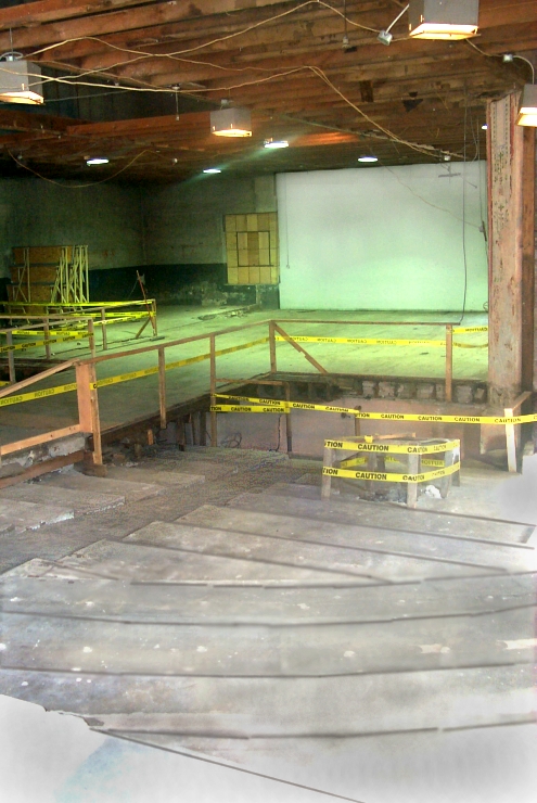 The stage area is in the background. The center section of the back wall has recently been painted white to be used as a projection screen. The boarded up window was added after the use as a theater ended. A portion of the orchestra pit can be seen beyond the yellow caution tape. A hole in the floor surrounded by caution tape is a mystery. Since it is near the boiler, it may have been chopped through to facilitate a chimney which was never installed. To the left is a portion of the floor which was added when the Sampson ceased it's theater operations. This floor covered the entire seating area, and will be completely removed. Again, the "hanging ceiling" was not original, and it's removal is also underway. |