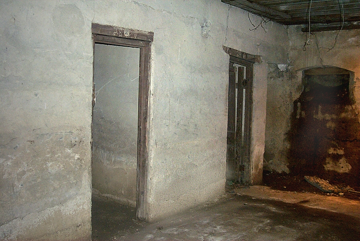 This area is pretty stark! It is an area that any dungeon master would be proud of! There is no evidence to indicate that it was ever anything but the bare unpainted concrete walls seen here. The ceiling is high and unfinished, consisting of bare stage floor joists. Several cubicles open off each side of a wide hallway which runs the 58 foot width of the Sampson. Old dressing room numbers remain tacked above each door. There are small windows in the Northern rooms similar to the one seen here at the end of the hallway. These are now boarded up. The rooms across the hall had no windows at all. |