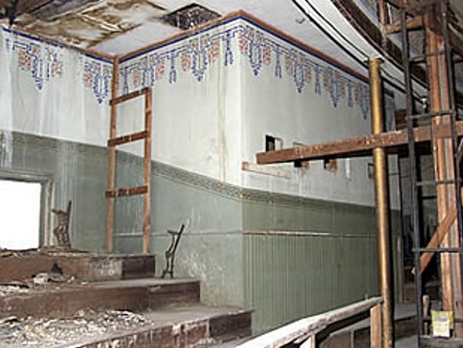 The projection booth was probably added when the second balcony or "gallery" was walled over in 1928. At the right is the framework of an overhead door which was added in front of the projection booth. this door and the false hanging ceiling were installed in 1936 when Wells Jewett converted the building to an automobile agency and service facility. |